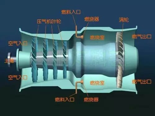 燃气轮机主要由压气机、燃烧室、涡轮三大部分组成,左边部分是压气机,有进气口,左边四排叶片构成压气机的四个叶轮,把进入的空气压缩为高压空气;中间部分是燃烧器段(燃烧室),内有燃烧器,把燃料与空气混合进行燃烧;右边是涡轮(透平),是空气膨胀做功的部件;右侧是燃气排出口。